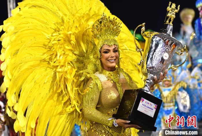 當地時間2月17日晚間,巴西聖保羅狂歡節冠軍(jun) 隊重返桑巴大道做收官遊行演出。圖為(wei) 一名桑巴舞校演員展示獎杯。記者林春茵攝