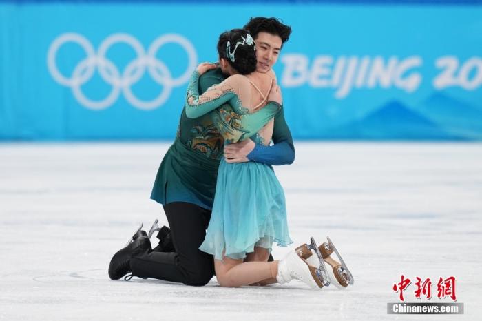 北京冬奧會(hui) 花樣滑冰冰上舞蹈自由舞比賽賽後,王詩玥/柳鑫宇跪地相擁。(資料圖)中新社記者 崔楠 攝