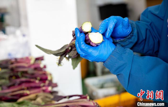 每天清早,趁露水未幹,菜農(nong) 便穿梭於(yu) 田壟間,長勢繁茂的菜薹如女子手腕粗細,葉片紅得發紫。菜農(nong) 手握掐刀,瞄準基部輕輕一掐,汁水四溢,拭塵土、扒外皮,即可生食。若是經曆寒風雪霜,更是甘甜。