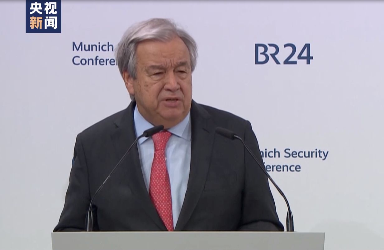 △2月16日,聯合國秘書(shu) 長古特雷斯在慕安會(hui) 上發表開幕致辭(圖由總台記者拍攝)