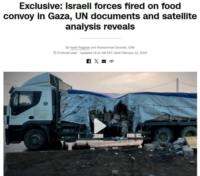 中新網2月21日電 美國有線電視新聞網(CNN)2月21日根據聯合國文件報道稱,以色列軍(jun) 隊2月5日曾向加沙地帶中部一支聯合國運糧車隊開火,並最終阻止了車隊繼續前進。