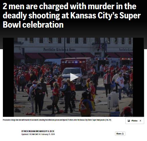 中新網2月21日電 據美聯社報道,當地時間20日,一份公開的法庭文件顯示,美國堪薩斯城“超級碗”遊行發生的槍擊事件中,兩(liang) 名男子被控謀殺,報道稱“兩(liang) 人在爭(zheng) 吵後不久掏出了槍並開槍射擊”。