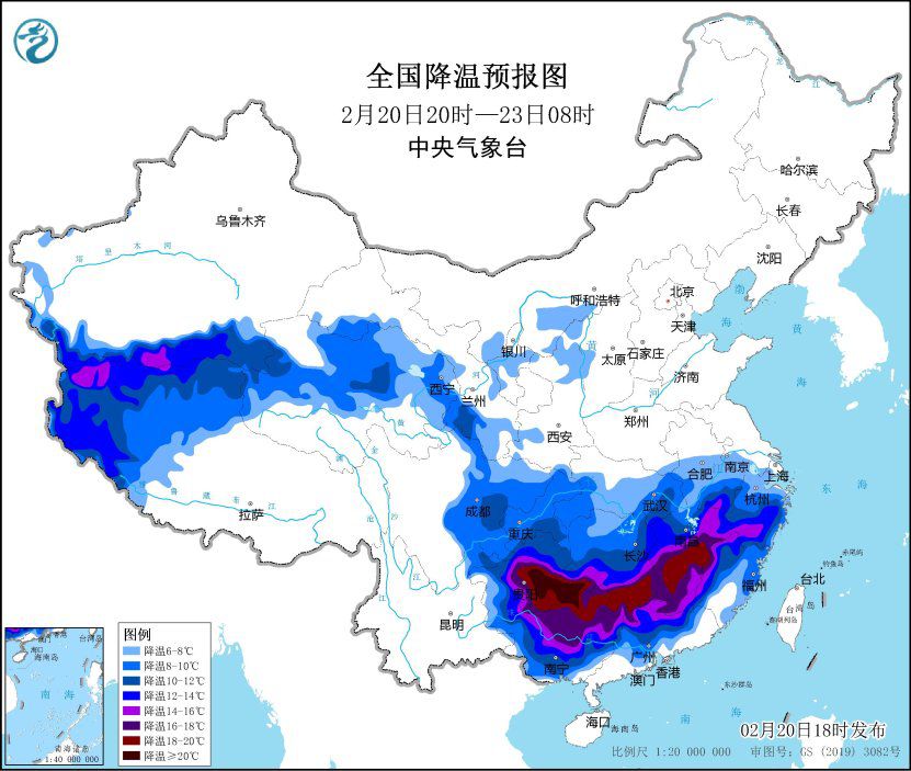 中新網2月20日電 據中央氣象台網站消息,中央氣象台2月20日18時繼續發布寒潮橙色預警:受寒潮影響,預計,2月20日20時至2月23日,我國南方大部地區將出現降溫,日平均或最低氣溫普遍下降8~12℃,西南地區東(dong) 南部、江南大部、華南中北部等地氣溫下降12~18℃,其中,貴州東(dong) 南部、湖南西南部、廣西北部等地的部分地區累計降溫幅度可達20℃以上。2月23日前後,最低溫度0℃線將南壓到蘇皖南部至湖南南部、貴州南部一帶。