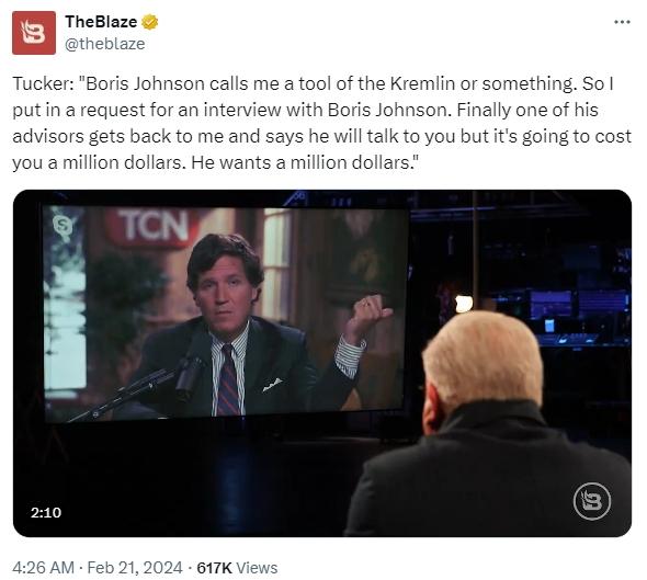 中新網2月21日電 綜合外媒消息,近日,美國記者卡爾森在接受美國新聞網站“TheBlaze”的采訪時透露,他此前曾試圖采訪英國前首相約翰遜,但約翰遜要卡爾森支付100萬(wan) 美元才同意接受采訪。