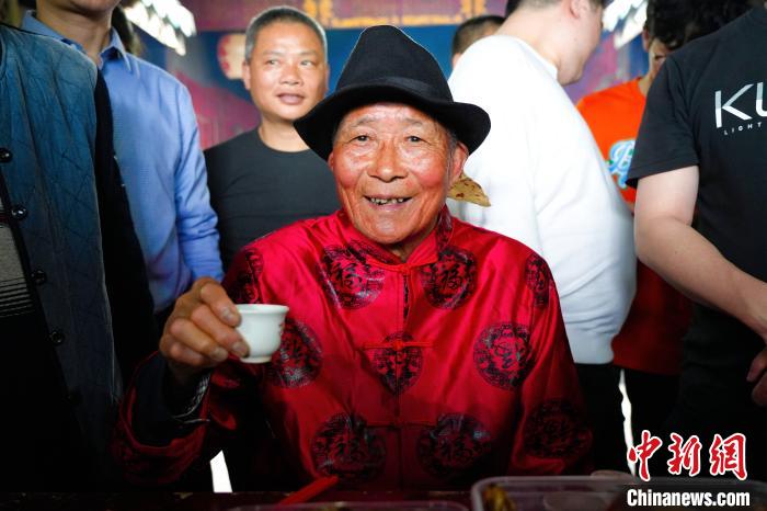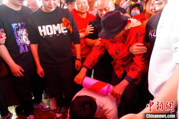 隻見“酒醉公”身著紅色唐裝,頭戴禮帽,右手舉(ju) 著一隻麵棰,用紅紙包著,寫(xie) 有“早生貴子”4個(ge) 字。他逐一“打”前一年剛結婚的“新郎官”,從(cong) 他們(men) 的左肩上輕輕滾打而下,再從(cong) 下滾打上右肩,邊滾打,邊講些祝願他們(men) 夫婦新婚添丁、幸福美滿的吉祥話。