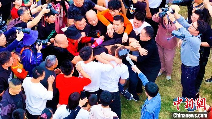 “酒醉公”手持擀麵杖,逐一“打”前一年剛結婚的“新郎官”。永定區融媒體(ti) 中心供圖