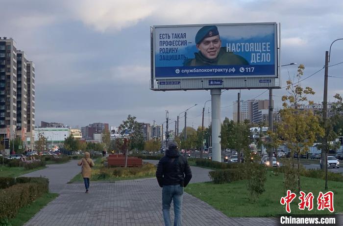 2023年10月,俄羅斯聖彼得堡街道上的征兵海報。 中新社記者 商永 攝