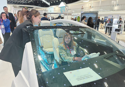參觀者在華為(wei) 展廳體(ti) 驗5G-A車路雲(yun) 協同、車載娛樂(le) 項目。