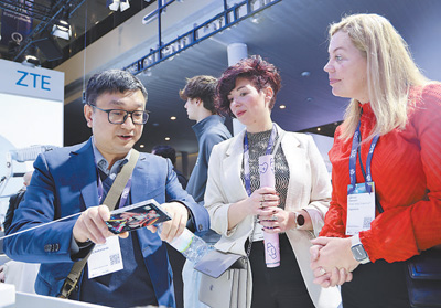 在中興(xing) 通訊展廳,工作人員向參觀者介紹最新產(chan) 品。