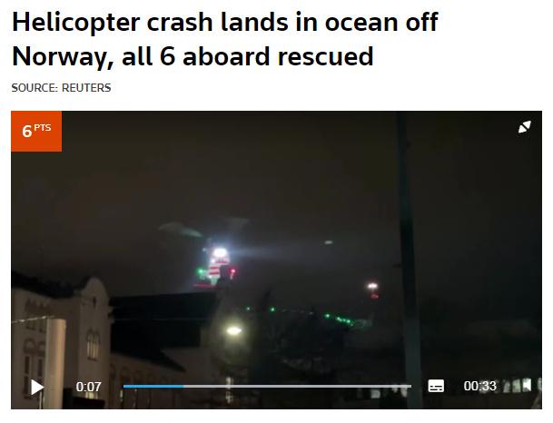 中新網2月29日電 據路透社報道,當地時間28日,挪威聯合救援協調中心稱,一架載有6人的直升機在挪威西部海岸附近海域墜毀,機上所有人員隨後被從(cong) 海中救起。