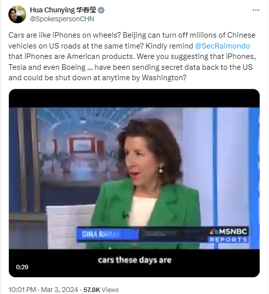3月3日,華春瑩在社交媒體(ti) 上發文回應美方這番言論,“汽車就像是裝了輪子的iphoness(蘋果手機)?北京能讓美國道路上的數百萬(wan) 中國汽車同時熄火?友好提醒一下,iphoness是美國產(chan) 品。你是不是在暗示iphoness、特斯拉甚至波音……一直在將機密數據傳(chuan) 送回美國,隨時可能被華盛頓關(guan) 停?”