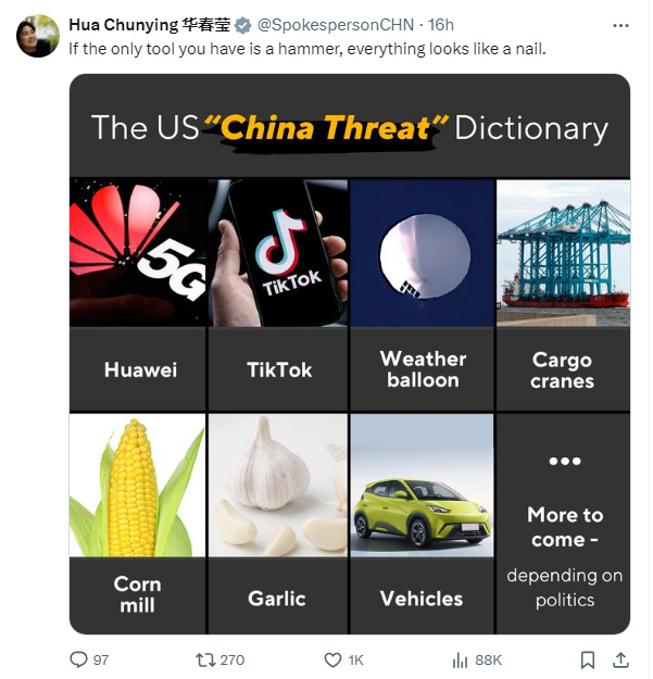 此外,在另一條貼文中,華春瑩表示,“如果你唯一的工具是錘子,那麽(me) 所有東(dong) 西看起來都像釘子。”