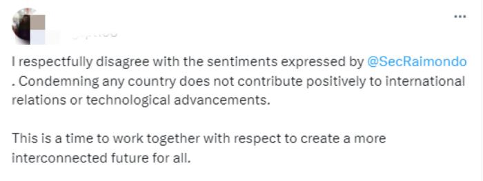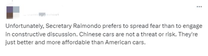 一名外國網友表示,雷蒙多喜歡“散布恐懼,而非進行建設性的討論”,而“中國製造的汽車比美國汽車更好、更便宜”。