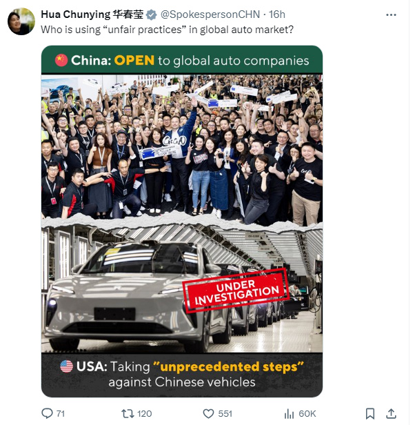 華春瑩還發布了一張圖,標明中國和美國在汽車領域的做法並寫(xie) 道,“是誰在全球汽車市場采取‘不公平的做法’?”