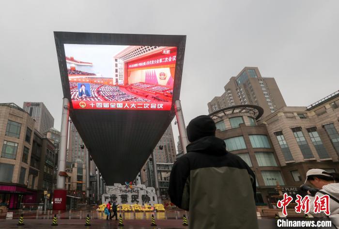 3月5日,十四屆全國人大二次會(hui) 議在北京人民大會(hui) 堂開幕。圖為(wei) 北京一戶外大屏播放開幕會(hui) 。 中新社記者 賈天勇 攝