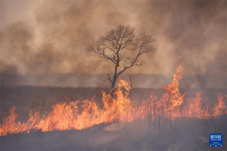 這是3月5日在俄羅斯濱海邊疆區南部拍攝的野火現場。新華社發(郭飛洲攝)