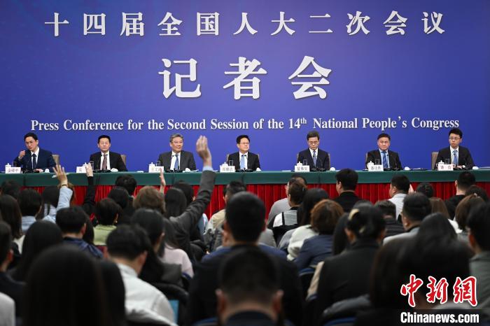 3月6日,十四屆全國人大二次會(hui) 議在北京舉(ju) 行記者會(hui) ,國家發展和改革委員會(hui) 主任鄭柵潔、財政部部長藍佛安、商務部部長王文濤、中國人民銀行行長潘功勝、中國證券監督管理委員會(hui) 主席吳清就發展改革、財政預算、商務、金融證券等相關(guan) 問題回答中外記者提問。圖為(wei) 記者舉(ju) 手提問。 中新社記者 何蓬磊 攝
