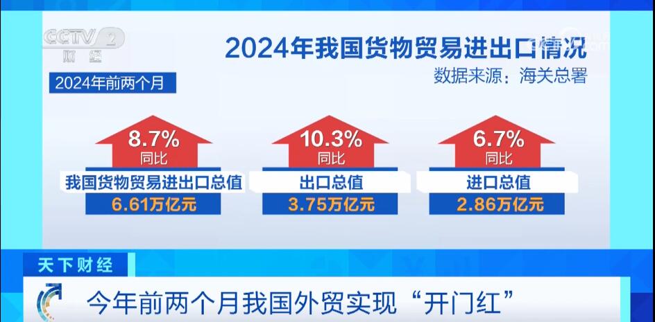 央視網消息:海關(guan) 總署3月7日發布,今年前2個(ge) 月,我國貨物貿易進出口同比增長8.7%,出口更是達到兩(liang) 位數增長,外貿實現“開門紅”。