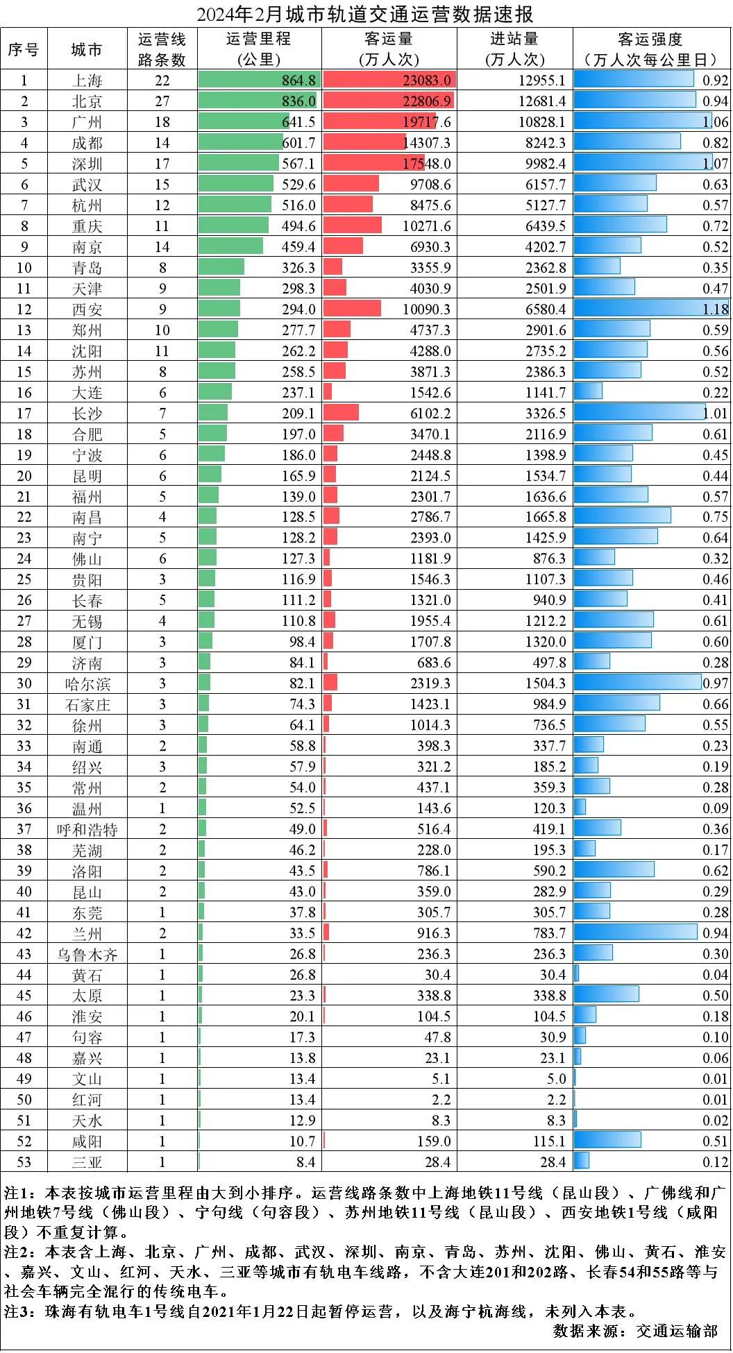 中新網3月12日電 據交通運輸部微信公眾(zhong) 號消息,2024年2月,31個(ge) 省(自治區、直轄市)和新疆生產(chan) 建設兵團共有55個(ge) 城市開通運營城市軌道交通線路308條,運營裏程10205.6公裏,實際開行列車317萬(wan) 列次,完成客運量20.5億(yi) 人次,進站量12.4億(yi) 人次。2月份,客運量環比減少6.1億(yi) 人次,降低22.9%,同比減少1.3億(yi) 人次,降低6%。2月份全國總運營裏程的平均客運強度為(wei) 0.693萬(wan) 人次每公裏日,環比降低17.6%,同比降低14.4%。本月無新開通線路。