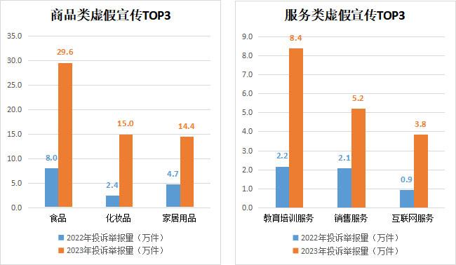 消費者在購物時會(hui) 接觸到各種各樣的宣傳(chuan) 信息,但海量的宣傳(chuan) 信息並非都是真實可信的,一些商家以誇大其詞、隱瞞真相等手段,誘使消費者做出錯誤的消費選擇。2023年,全國12315平台接收虛假宣傳(chuan) 投訴舉(ju) 報144.3萬(wan) 件,同比增長1.7倍。從(cong) 商品服務類別來看,商品類別中虛假宣傳(chuan) 投訴舉(ju) 報較多的有食品(29.6萬(wan) 件)、化妝品(15萬(wan) 件)、家居用品(14.4萬(wan) 件);服務類別中虛假宣傳(chuan) 投訴舉(ju) 報較多的有教育培訓服務(8.4萬(wan) 件)、銷售服務(5.2萬(wan) 件)、互聯網服務(3.8萬(wan) 件)。消費者反映的問題主要集中在商家虛構產(chan) 品效果、誇大產(chan) 品優(you) 勢,通過“好評返現”提高虛假聲譽,誤導消費者購買(mai) 等。