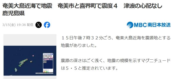 中新網3月15日電 據“南日本放送”消息,當地時間3月15日19時32分,日本奄美大島近海發生5.5級地震。