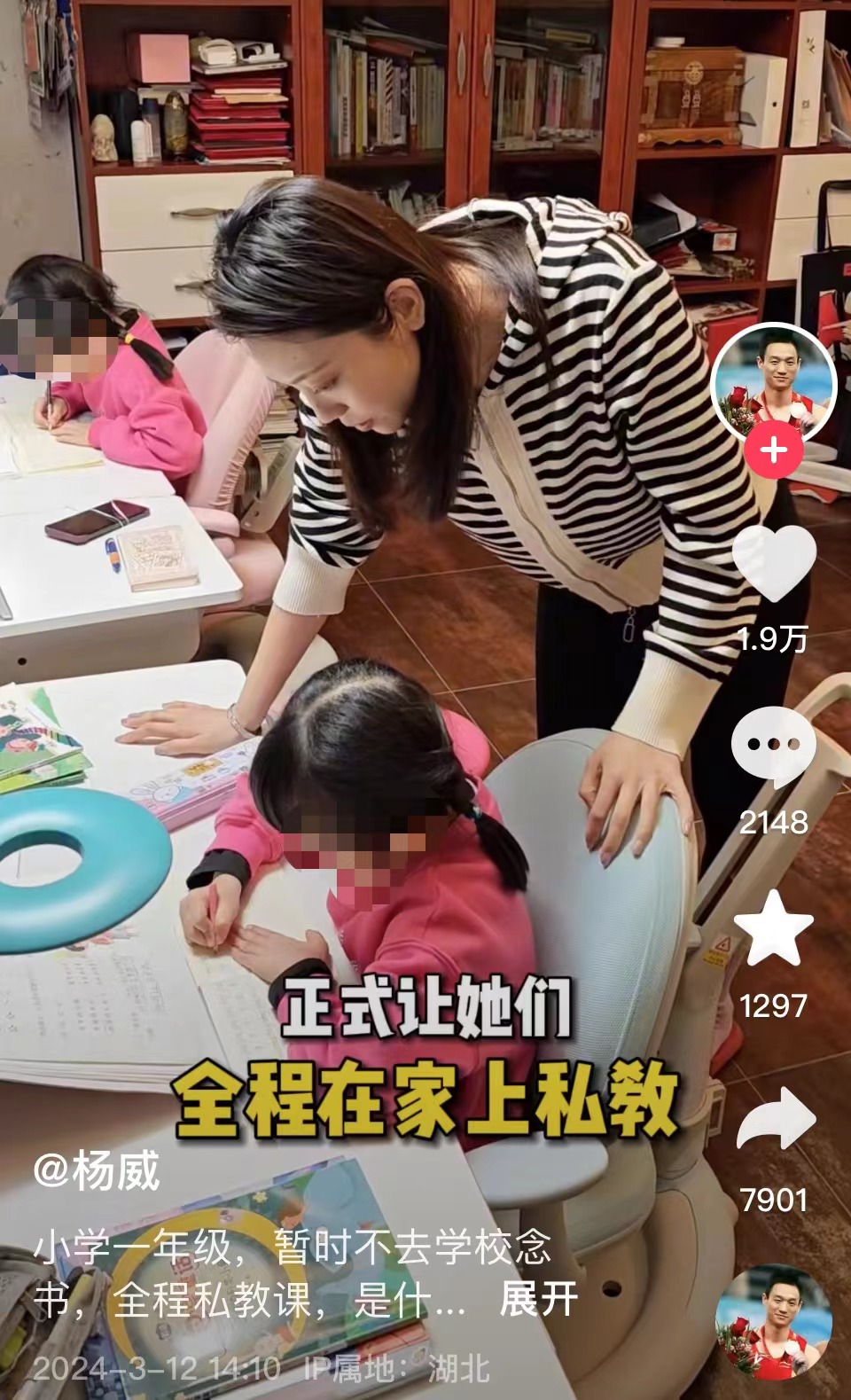 近日,體(ti) 操奧運冠軍(jun) 楊威在社交平台發布視頻稱,由於(yu) 去年兩(liang) 個(ge) 女兒(er) 連生好幾場病後,他跟妻子楊雲(yun) 做了個(ge) 大膽嚐試,讓上一年級的兩(liang) 個(ge) 女兒(er) 暫時不去學校念書(shu) ,全程在家上私教。