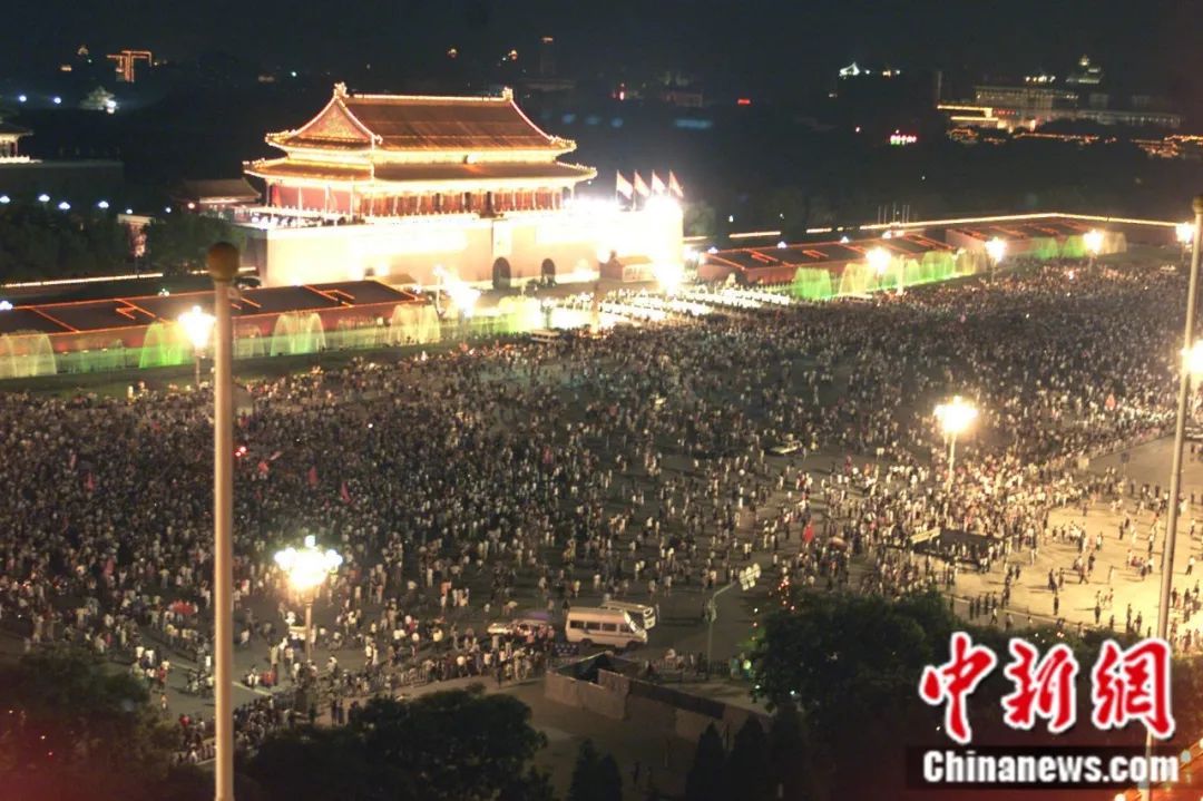 2001年7月13日晚,北京天安門廣場人潮湧動,數以十萬(wan) 計的民眾(zhong) 徹夜不眠慶祝北京申奧成功。毛建軍(jun) 攝