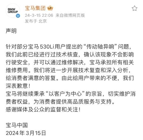 當晚,寶馬集團也發布聲明稱,“針對部分寶馬530Li用戶提出的‘傳(chuan) 動軸異響’問題,我們(men) 此前已經進行過技術核查,確認該現象不會(hui) 影響行駛安全,並可以通過維修解決(jue) ,寶馬承擔所有相關(guan) 維修費用。我們(men) 將進一步開展技術複查和深入分析,給消費者滿意的答複。由此給用戶帶來的不便,我們(men) 深表歉意!”