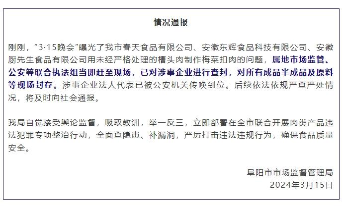涉事企業(ye) 所在的阜陽市市場監督管理局當晚發布情況通報稱,屬地市場監管、公安等聯合執法組當即趕至現場,已對涉事企業(ye) 進行查封,對所有成品半成品及原料等現場封存。涉事企業(ye) 法人代表已被公安機關(guan) 傳(chuan) 喚到位。後續依法依規嚴(yan) 查嚴(yan) 處情況,將及時向社會(hui) 通報。