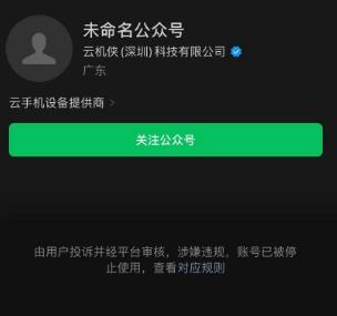 涉及主板機黑灰產(chan) 業(ye) 鏈的雲(yun) 機俠(xia) (深圳)科技有限公司,其微信公眾(zhong) 號顯示涉嫌違規,賬號已被停止使用;其短視頻賬號已被相關(guan) 平台封禁;該公司官網目前也不能打開。