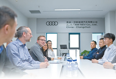 近年來,許多外國專(zhuan) 家感受到發展機遇,來到中國安居樂(le) 業(ye) 。圖為(wei) 德國工程師薩沙(左三)與(yu) 妻子約翰娜(左四)在位於(yu) 吉林長春的奧迪一汽新能源汽車有限公司會(hui) 議室開會(hui) 。