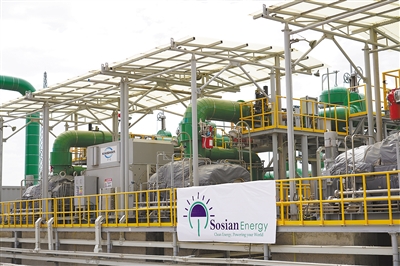 由中國企業(ye) 承建的肯尼亞(ya) 索西安地熱電站於(yu) 去年6月底投產(chan) 送電,成為(wei) 非洲首個(ge) 從(cong) 設計、產(chan) 品生產(chan) 到建設、調試完全由中國企業(ye) 獨立完成的地熱發電站。該電站設計裝機容量35兆瓦,每年可減少二氧化碳排放24萬(wan) 噸。圖為(wei) 索西安地熱電站2號發電機組。