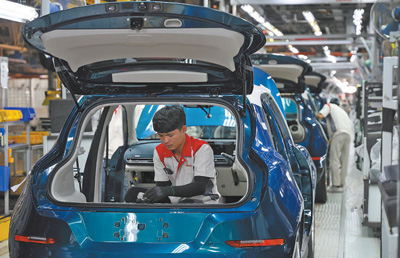 今年1月,中國車企長城汽車旗下電動汽車歐拉好貓在泰國羅勇新能源汽車製造基地正式下線,成為(wei) 泰國首款本土量產(chan) 的純電車型,將加速泰國汽車行業(ye) 電氣化轉型。圖為(wei) 該製造基地的生產(chan) 車間內(nei) ,工人在進行汽車裝配作業(ye) 。