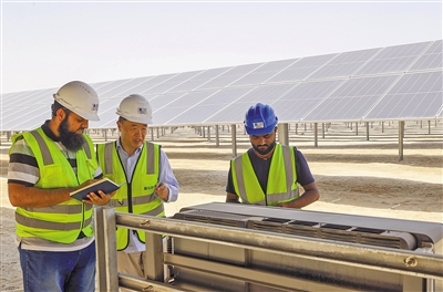 由中國企業(ye) 總承包的阿聯酋艾爾達芙拉光伏電站可供20萬(wan) 戶居民用電,每年減少二氧化碳排放240萬(wan) 噸,使清潔能源在阿聯酋總能源結構中的比重提高到13%以上。圖為(wei) 中外員工在艾爾達芙拉光伏電站工作。