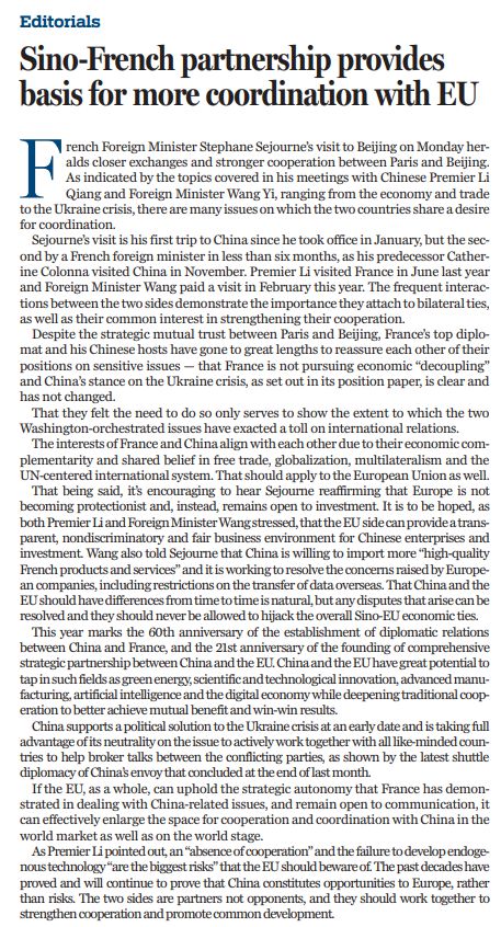 今年是中法建交60周年,也是中歐建立全麵戰略夥(huo) 伴關(guan) 係21周年。中歐在綠色能源、科技創新、先進製造、人工智能、數字經濟等領域大有可為(wei) ,同時也要深化傳(chuan) 統合作,更好實現互利共贏。