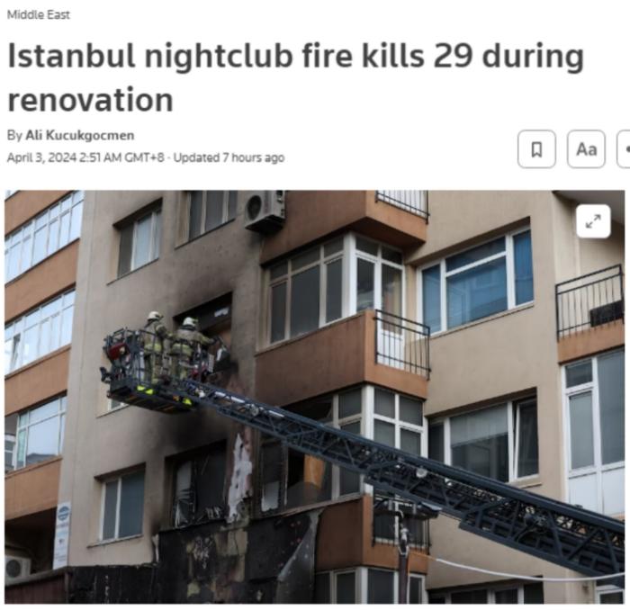 中新網4月3日電 據路透社報道,當地時間2日,土耳其伊斯坦布爾一家位於(yu) 多層建築內(nei) 的夜總會(hui) 發生火災,造成至少29人遇難。