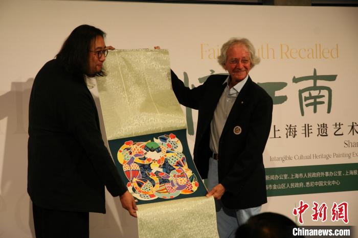 當地時間4月2日,“魅力上海”係列《憶江南——上海非遺藝術展(悉尼站)》在悉尼歌劇院正式開幕。圖為(wei) “80後”農(nong) 民畫家李元(左)向澳大利亞(ya) 水彩畫協會(hui) 主席大衛·範·紐恩(右)贈送了農(nong) 民畫作品《花鵝》。中新社記者 顧時宏 攝