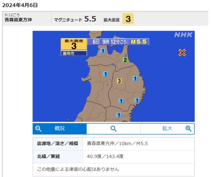 中新網4月6日電 據日本廣播協會(hui) (NHK)報道,當地時間6日9時12分,日本青森縣海域發生5.5級地震,震源深度10千米。