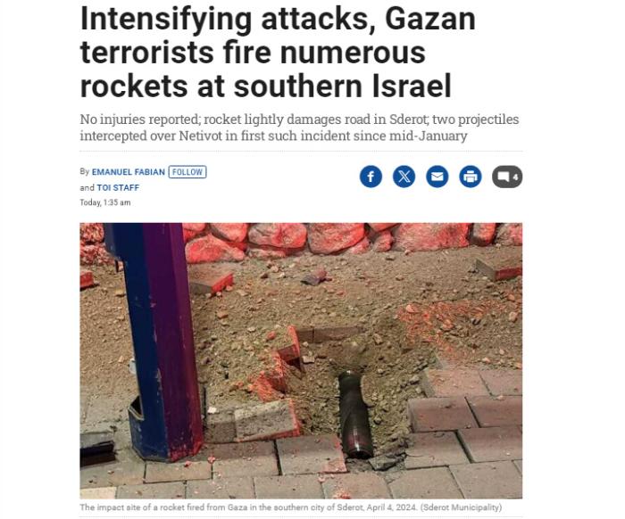 中新網4月5日電 據《以色列時報》報道,當地時間4日晚,以色列國防軍(jun) 表示,以色列南部城市斯代羅特遭加沙地帶發射的兩(liang) 枚火箭彈襲擊。