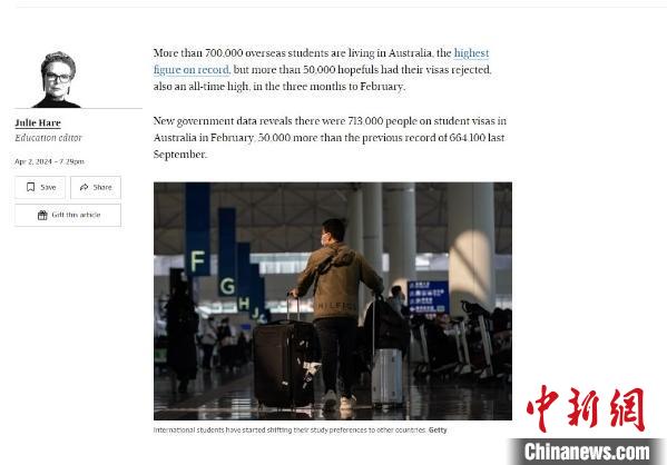 中新網4月4日電 據澳大利亞(ya) 最新政府數據,截至今年2月的三個(ge) 月內(nei) ,有超過70萬(wan) 名海外學生居住在澳大利亞(ya) ,這是有記錄以來的最高數字,但同時也有超過5萬(wan) 名申請簽證的留學生被拒,這也是曆史最高水平。