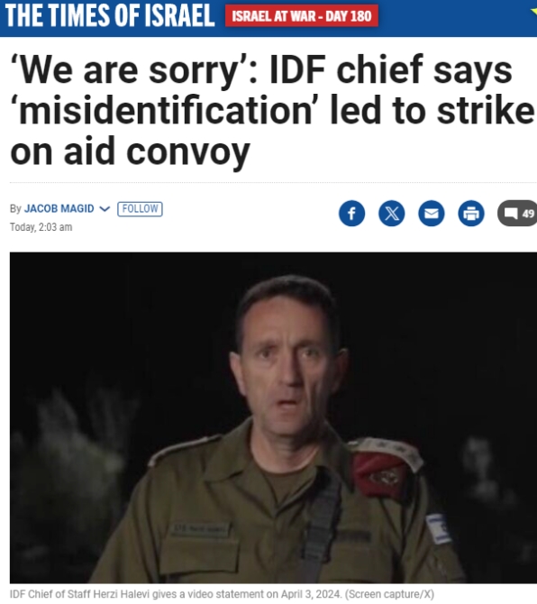 哈萊維表示,以軍(jun) 無意傷(shang) 害“世界中央廚房”援助人員,該事件是“在夜間、在戰爭(zheng) 期間、在非常複雜的條件下因識別錯誤造成的誤傷(shang) ”,原本不該發生。他表示,以軍(jun) “對無意中傷(shang) 害到‘世界中央廚房’成員感到抱歉”。