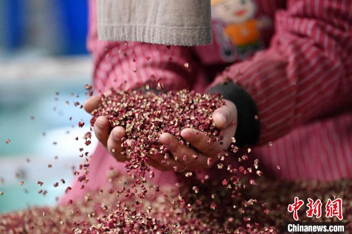 圖為(wei) 工作人員檢查初篩的花椒。(資料圖) 九美旦增 攝
