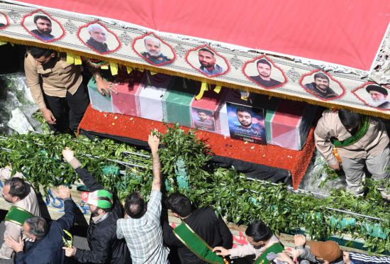 4月5日,在伊朗德黑蘭(lan) ,人們(men) 參加伊朗駐敘使館遭襲事件中喪(sang) 生的7名伊朗伊斯蘭(lan) 革命衛隊成員的葬禮。新華社記者沙達提攝