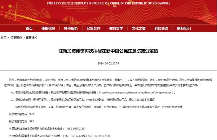 目前,新每周報告確診病例超300例,鑒於(yu) 新登革熱傳(chuan) 統高發季節(每年5到10月)臨(lin) 近,並且近期新加坡天氣炎熱,登革熱傳(chuan) 播風險高企,駐新加坡使館提醒在新中國公民注意防範登革熱:
