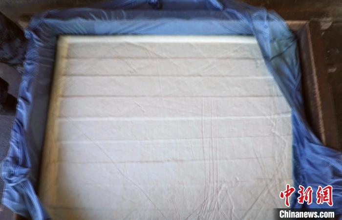 豆漿與(yu) 石膏相遇,化學反應後,豆香味縈繞在鼻尖,香氣彌漫在空氣中。這時,王誌勇蓋上空隙均勻的木頭壓板,壓上石墩子,讓豆腐腦中的水分通過籠布和蓋板上的洞流走,等待豆腐壓好成型。
