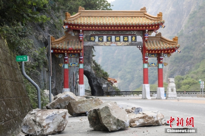 圖為(wei) 位於(yu) 太魯閣公園的中橫公路入口,立霧溪出海口兩(liang) 側(ce) 山體(ti) 有明顯滑坡痕跡。“東(dong) 西橫貫公路”牌樓前,靠山體(ti) 一側(ce) 道路落滿大石。中新社記者 楊程晨 攝