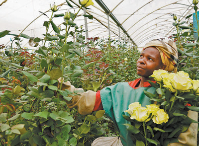 近年來,鮮花是肯尼亞(ya) 出口中國的主要農(nong) 產(chan) 品之一。圖為(wei) 在肯尼亞(ya) 奈瓦沙湖畔的一家鮮花農(nong) 場,一名花農(nong) 正在采摘鮮花。