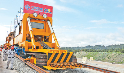 在馬來西亞(ya) 彭亨州關(guan) 丹市馬東(dong) 鐵項目現場,鋪軌機正在作業(ye) 。