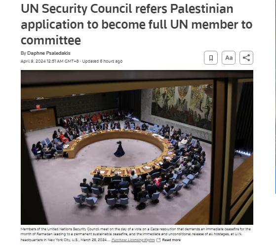 中新網4月9日電 據路透社報道,當地時間4月8日,聯合國安理會(hui) 將巴勒斯坦成為(wei) 聯合國正式會(hui) 員國的申請提交安理會(hui) 新成員接納委員會(hui) 。