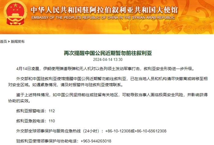 使館消息稱,4月14日淩晨,伊朗使用彈道導彈和無人機對以色列領土發動軍(jun) 事打擊,敘利亞(ya) 安全形勢進一步升級。